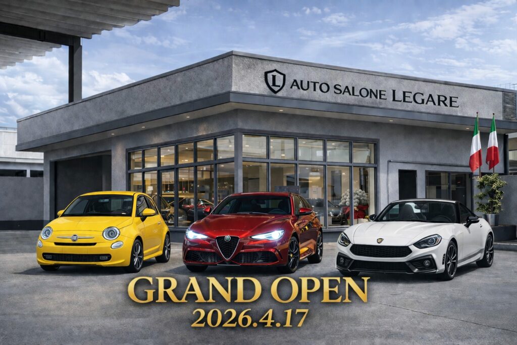 GRAND OPEN! 2026-04-16 最終更新日時 : 2026-04-17 Sakamoto 2026年4月17日にアルファロメオ・フィアット・アバルト・輸入車専門店 Auto Salone LegareがGRAND OPEN! 「誰にでも似合う車なんて、つまらない。」 あなたのための一台を、ここで。 アルファロメオ・フィアット・アバルトを中心に、“感性で選ぶ一台”をご提案します。 オープン記念特典もご用意しておりますので、詳細はスタッフまでお気軽にお問い合わせください。 全国陸送納車・オンライン商談対応ぜひ一度、体感してください。 皆様のご来店をお待ちしております。 \ 最新情報をチェック / @vektor_inc